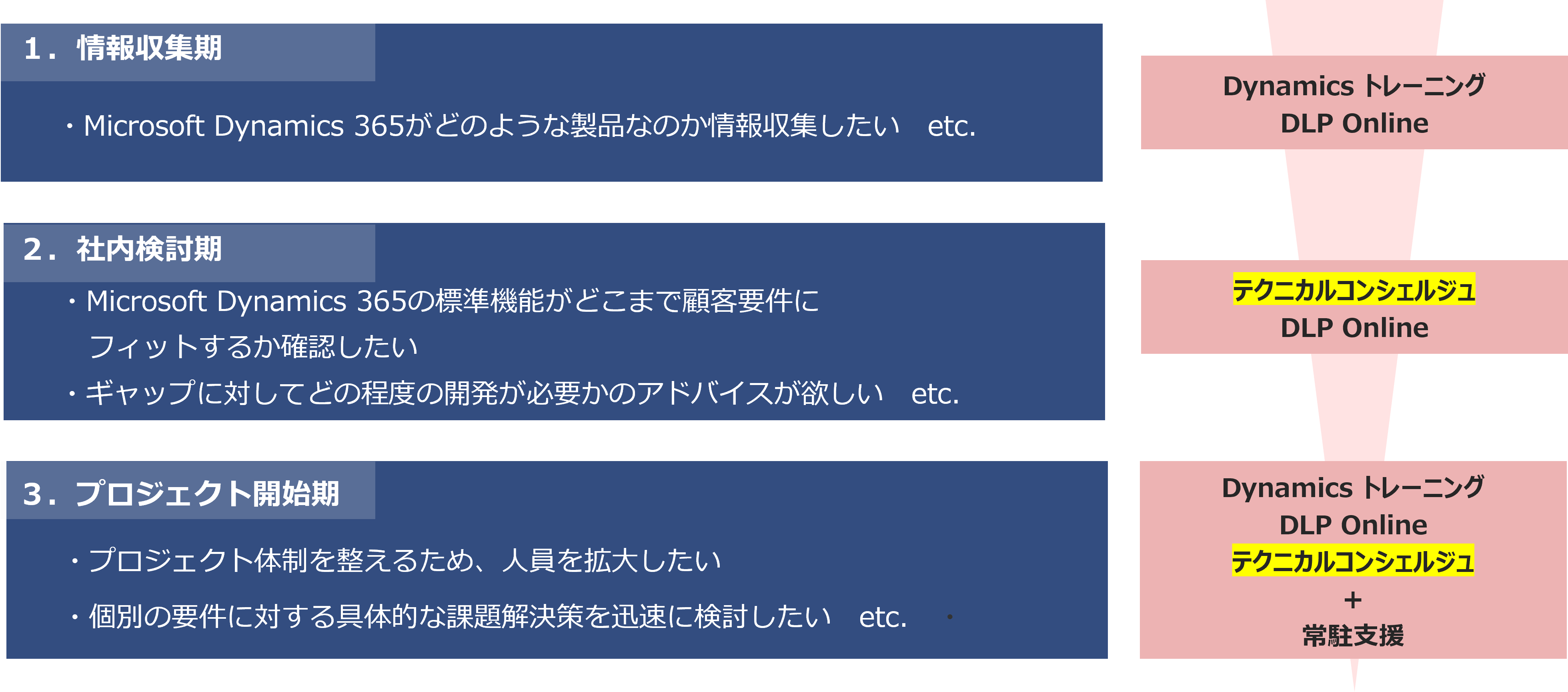今回、ご紹介したテクニカルコンシェルジュとトレーニング、そして弊社が抱えるMicrosoft Dynamicsの専門コンサル、エンジニアの常駐支援と併用していただくことで、より効率的にプロジェクトを推進していただくことが可能となります。 ぜひご検討下さい。